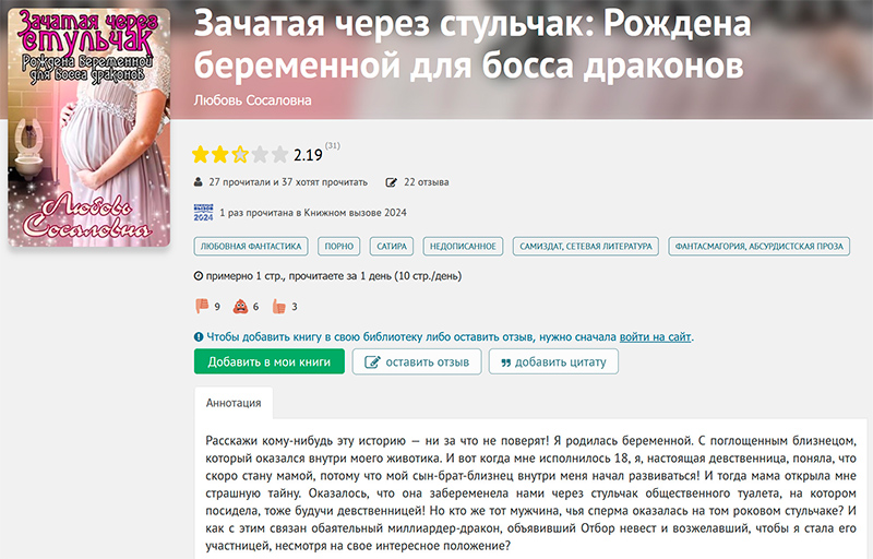 Кто-то, рассказал Антон хорошо постебался над всякими амелиями борн с их "зачатием через полотенце". Эта книжка (там даже есть первая глава) некоторое время висела на Litnet, пока даже до тамошних админов не дошло, что над ними издеваются.