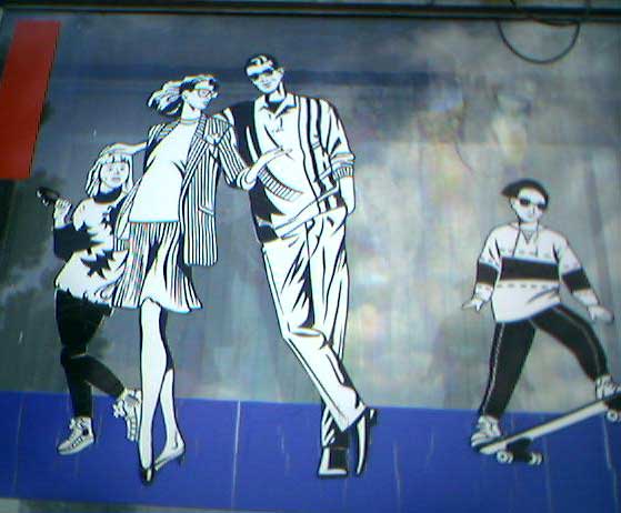 Итак, кто же у них рекламирует качество оптики? Слепой скейтбордист и мужик, который сослепу оперся о голову девчушки слева. Хороший магазин, короче говоря. И художник тоже классный. Концептуалист.