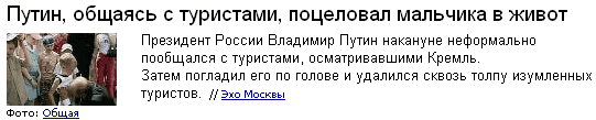 Радиостанция "Эхо Москвы", как рассказал Александр BX Олейников, не могла пройти мимо знаменитого поцелуя президента. По их версии гарант не только поцеловал мальчика в живот, но и погладил по голове всех туристов: