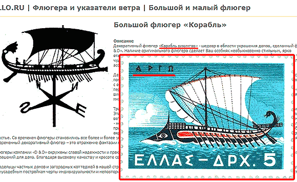Правда, когда приглядишься к этому кораблю, то выясняется, что это греческая триера, но до таких ли тонкостей разработчикам флюгеров? Хорошо хоть не крейсер "Аврора" изобразили...