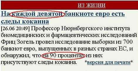 И дело не в том, что новостисты каждую девятую банкноту почему-то считают за 90% и на оставшиеся 10% банкнот и живут, а в самое новости. Раз там следы кокаина, то кто мешает аккуратно отобрать каждые девятые банкноты и насладиться ими по полной программе, а?