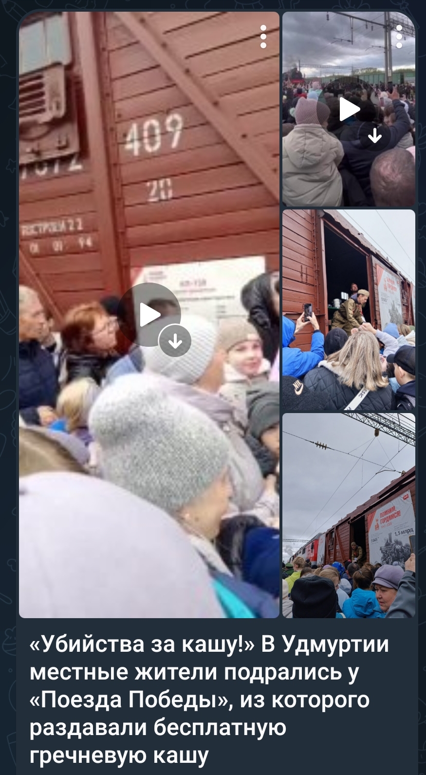 1 мая в город Сарапул в Удмуртии прибыл «Поезд Победы», стилизованный под период Великой Отечественной войны. Местные жители собрались у ж/д вокзала для встречи состава, из которого волонтеры раздавали бесплатную гречневую кашу. Это вызвало конфликты и давку у собравшихся.