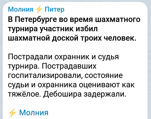 65-летний Сергей Видякин попал в реанимацию. Он получил травмы головы, грудной клетки и туловища. Помимо этого, шахматный тренер получил отравление этанолом, его состояние также является тяжелым.