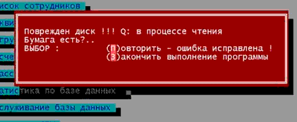 Видали, что вытворяет эта, с позволения сказать, программуля? В процессе чтения повредила диск, а теперь еще и бумагу требует - я даже боюсь подумать, зачем. Интересно, как они предполагают исправить ошибку в ответ на вопрос "Бумага есть?"... Впрочем, эта программа отчета для пенсионного фонда сама по себе - нескончаемый анекдот. Я с ней в первый раз столкнулся года четыре назад и прекрасно помню, какое потрясающее впечатление она на меня произвела. Программа, написанная в 1998 году, выглядела на порядок хуже извращений, которые мы писали на gwbasic году в 87.