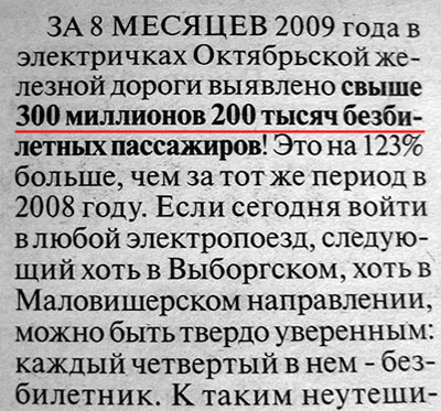 Таким образом, за 8 месяцев (примерно 244 дня) выявлено 300 000 000 плюс 200 000 безбилетников. То есть 1 230 327 безбилетников в день. Миллион двести тысяч безбилетников в день выявляется: да их даже просто по головам пересчитать - задача неподъемная!