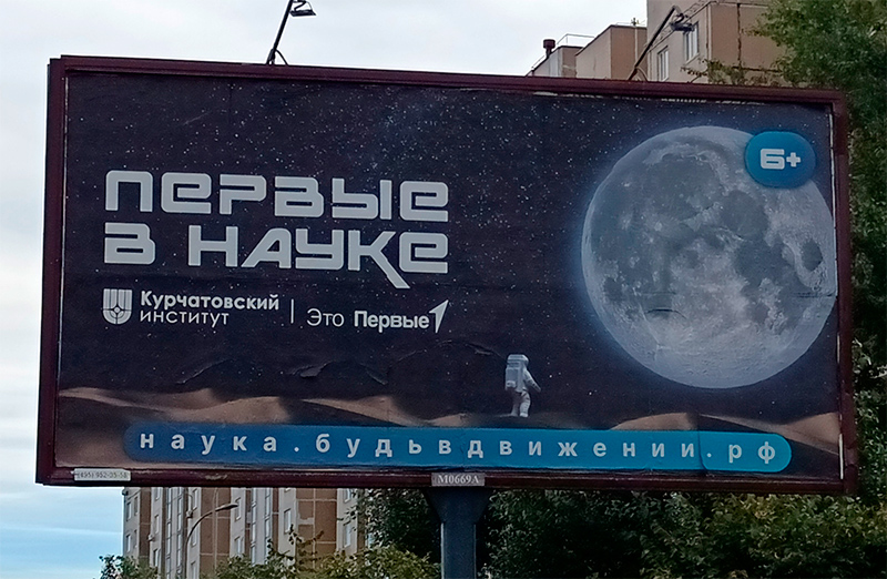 Плакатец, конечно, не просто странный, он предельно нелепый. Хвастливое заявление "Первые в науке" (это они-то - первые; среди кого?) и при этом рисунок космонавта, с тоской смотрящего на Луну, на которой РФ никогда не высаживалась, в отличие от американцев? То есть смысл плаката "Мы просрали лунную гонку, но зато мы первые в науке среди Курчатовского института"? Потрясающе, конечно.