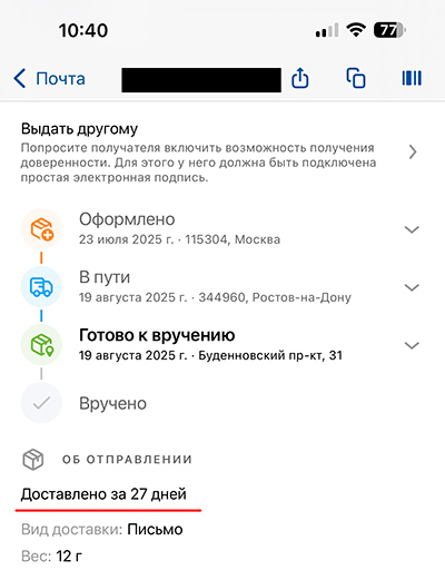 Почта России, рассказал Андрей, ставит новые рекорды. Письмо из Москвы до Ростова-на-Дону за 27 дней - это прям круто! Им надо новый слоган взять: "Почта России - НЕ ДОЖДЕССЯ!"