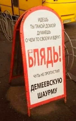 С демеевской шаурмой какой-то очень бородатый прикол. Демеевка — район в Киеве, там теперь станция метро Демієвськая Вряд ли эта надпись моложе 2014 года и невозможна после 2022 года, у нас тут больше нет вывесок на русском.