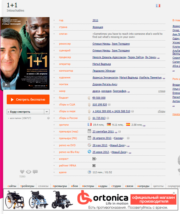 Михаил изрядно удивлен тем, насколько точно на "Кинопоиске" подбирается контекстная реклама к фильму "1+1".
