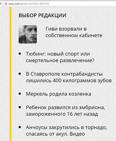 Вы думаете, это какая-нибудь экспресс-газетенка, спрашивает Андрей? Нет, это самые что ни на есть официальные "Вести.ру". Но мы уважаем выбор редакции, уважаем. Однако не понимаем, почему нет новости "Умер Якубович".