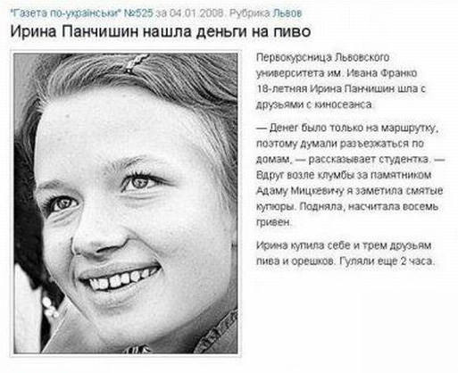 Впрочем, если денег на водку нет, то их можно найти, как эта прекрасная девушка, ставшая героиней украинской прессы. Правда, деньги пришлось потратить на пиво. Но это тоже - красота и здоровье!