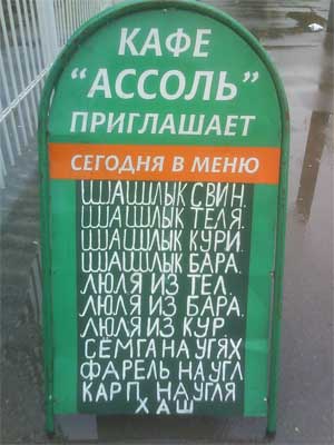 Ассортименту романтичнейшего кафе "Ассоль", рассказал Саид, тесно в узких рамках маленькой рекламки. Да и меню - изысканное. Шашлык из теля, люля из тел. Хорошо хоть семга на угях.