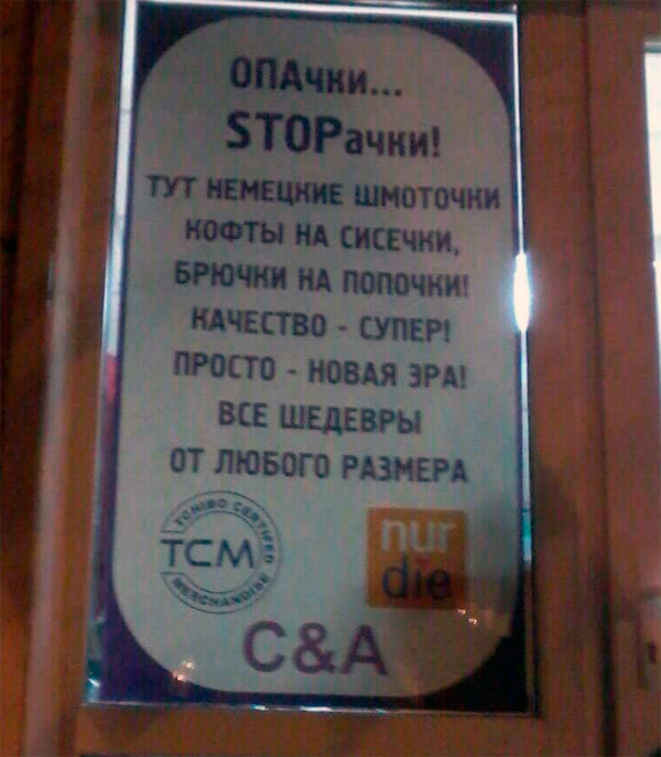 Одесса, конечно, порадовала. Но есть нюанс. В точности такой же текст я клеил четыре года назад для павильона на харьковском рынке Барабашова. И я отсылал фото с этим шедевром Алексу.