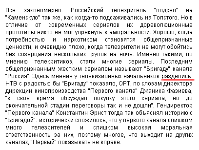 Итак, мнения телевизионных начальников раздеваются, девушки из ночных передач оголяются, бандюки в сериалах стреляются, наркоманы в киноэпопеях ширяются, а нравственность зрителей становится похожей на пачку "Марлборо": рак вызывает, но везде рекламируется. А что, зато прикольно...