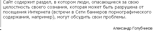 А ведь жалко Голубчикова, да? У него своя целостность сознания точно уже нарушена, раз он выдает такие перлы. Вероятно, он встретил в Сети баннеры порнографического содержания, например. Например, оно понятно, что на приличных сайтах баннеры порнографического содержания, да еще и такого, чтобы разрушить целостность сознания, не встретишь, однако можно же пойти по каким-нибудь интуитивно понятным адресам, где этих баннеров точно - вагон и маленький паровозик. Вот здесь, например (только просьба туда не заходить людям, опасающимся за свою целостность своего сознания) - sex.exler.ru...