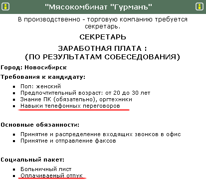 Только имейте в виду, что у вас обязательно должны быть навыки телефонных переговоров. Ну, хотя бы вы должны знать, где находится трубка, а также уметь говорить: "Але" и "Да не туда ты попал, козел!" За это вас ожидает хорошая зарплата и потрясающий социальный пакет! Я такого нигде не видел.