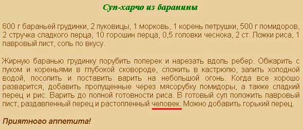 Ну как? Растопленный человек - это круто! Интересно, как они предполагают его растопить? Нежной лаской? Чтобы он весь просто растаял?.. Я уж молчу о том, что этот человек должен быть изрядным бараном. Ведь в заголовке ясно написано - суп-харчо из баранины.