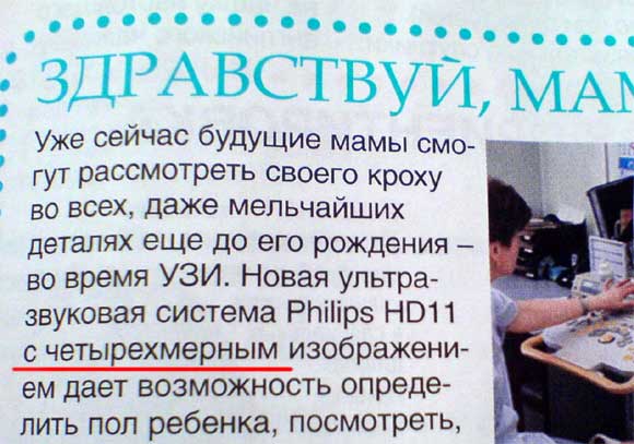 Пока лучшие умы человечества бьются над созданием трехмерных изображений, замечает Павел, в журнале Gloria изобрели монитор с четырехмерным. Он, видать, пронзает время, демонстрируя весь жизненный путь малыша: