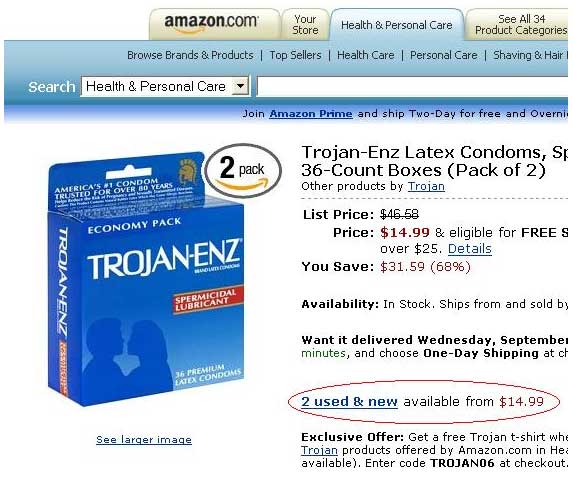 На "Амазоне", как известно, сообщил 20lvo, продаются вещи новые и слегка использованные. Вот эти две упаковки презервативов - слегка использованные. Но, кстати, почти как новые.