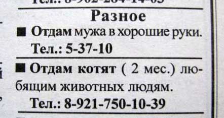 В Новгородской области, рассказал Владимир, отдают мужа в хорошие руки. Судя по всему, бесплатно отдают - лишь бы кормили и выгуливали. А нет, вру. Выгуливается он как раз сам. Поэтому и отдают.