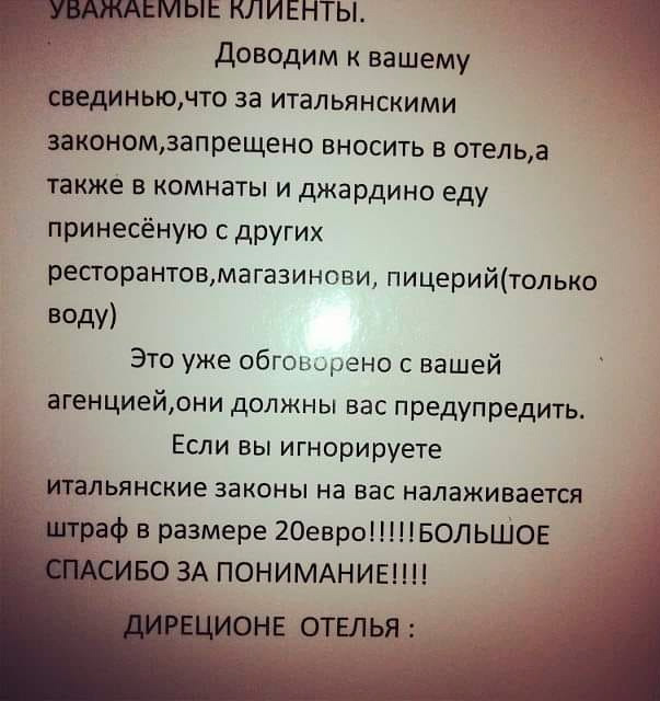 В Римини, рассказала Юлия, диреционе предупреждает! Не приносите в джардино еду. А то вам а-та-та и наладят штраф.