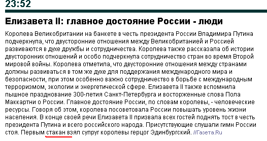 Взял стакан супруг, поднял его к губам, да ка-а-а-а-ак жахнул беленькой по-ихнему, по туманно-альбионски! А потом крепко расцеловал президента и сказал: "Я пил за тебя, Вова"! И все сразу поняли, какой он простой и добродушный парень, этот герцог Эдинбургский.