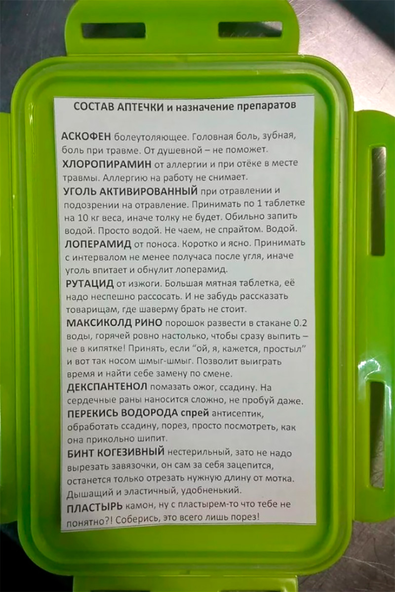 Инструкцию к этой аптечке, рассказал Антон, писал очень креативный человек.