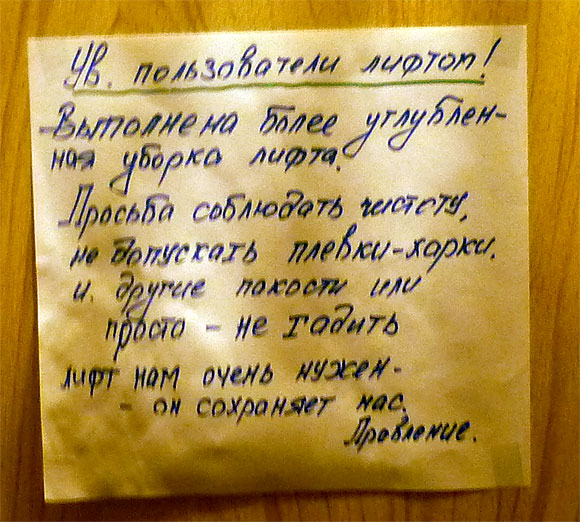 Денис был просто тронут этим объявлением, повешенным после более углубленной уборки лифта.