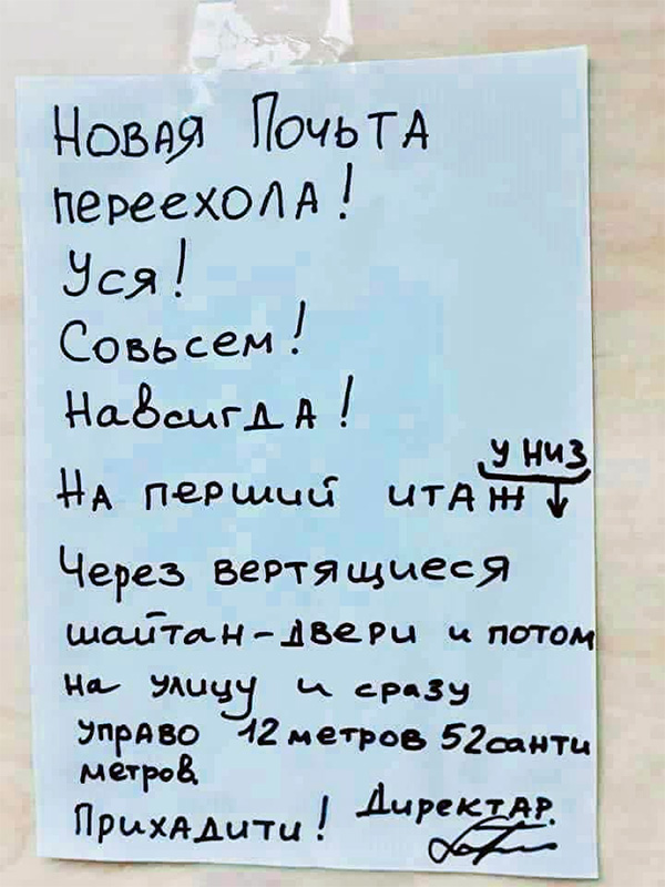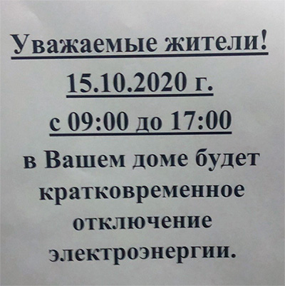 Александр не уверен, что отключение электричества аж на восемь часов - такое уж кратковременное, но мы считаем, что в администрации просто хорошо знают психологию бессознательного. Ведь если бы они написали "Будет отключено электричество на полный рабочий день" - жители бы загрустили. Но так как написано "кратковременно", то повода для грусти нет, ведь что такое какие-то восемь часов против вечности, правильно?