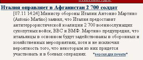 "Однако участие в хозяйственных мероприятиях должным образом закалит и подготовит наших итальянских бойцов, - заявил Мартино нашему корреспонденту. - Они изучат удушение врага макаронами, залепливание глаз лазаньей, захлебывание врага "Кьянти" и так далее. Главное в этом - чтобы наша армия сама не съела все то, что приготовила. Потому что в этом случае не останется никаких боеприпасов, и им останется воевать только палками салями."