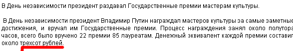 Обратите внимание на слово "денежный эквивалент". Я так думаю, что премии все-таки вручали водкой. По бутылке на брата. Как раз около трехсот рублей, если вести речь о качественной водке (вряд ли президент награждал мастеров культуры какой-нибудь "паленкой").