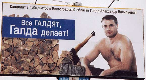 Ну и что же делает этот Галда, который Александр Васильевич? Рубит дрова. Как известно из фильма "Укрощение строптивого", рубка дров - это сублимация подавленной сексуальности. Учитывая еще совершенно неуместную демонстрацию свого волосатого торса, свидетельствующую о явно эксгибиционистских наклонностях, вырисовывается совершенно неприглядная картина. Такому человеку нельзя доверять Волгоградскую область! Он ее поимеет! Причем с особым цинизмом...