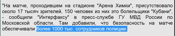 Ну, это нормально, сказал Rod Serg, читая данную заметку на Newsru. Как известно, на каждого жителя России сейчас приходится примерно по три мента. Здесь на 17 тысяч зрителей присутствовало более миллиона ментов, но футбол же!