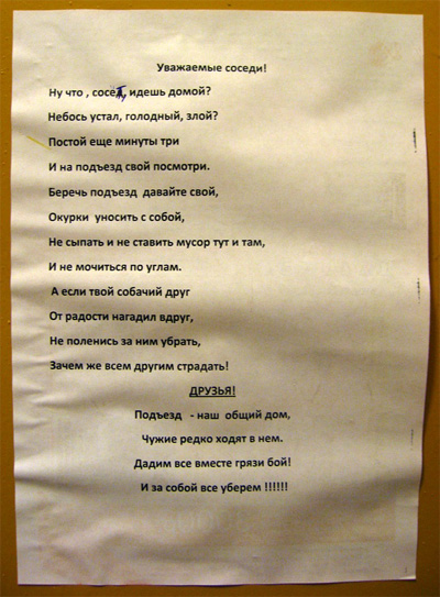 Еще и не самое плохое творчество, считает Вадим. Даже рифма где-то есть. Временами. Впрочем, конечно, людей, которые делают стихотворные объявления, все равно нужно убивать на месте. Подушкой по голове.