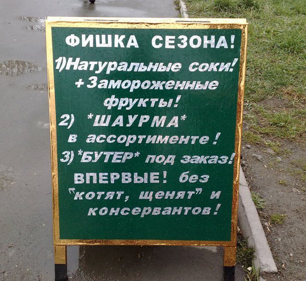 Вот умеют же завлечь! Натуральные соки, шаурма и бутер - без котят и щенят! Могут же, когда захотят!