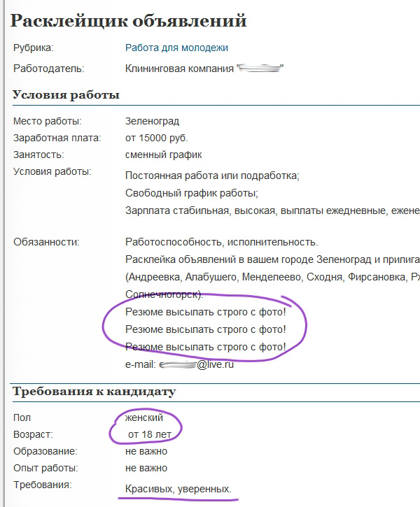 Алекс прислал крышесносящее объявление. Мужик из клининговой (!) компании, то есть, попросту говоря, уборщик, ищет расклейщиц объявлений - красивых и уверенных в себе девушек от 18 лет, причем резюме высылать строго с фото. Похоже, что мужик лукавит, а девушек ждет намного более интересная работа, чем расклейка объявлений. Ну или их надо будет расклеивать прямо по телу клиента.