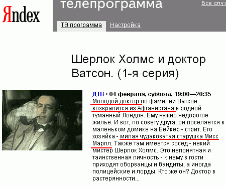А вот с программой у "Яндекса", сожалеет Helen, все как-то не фонтан. Никак у них молодой афганец не может угадать, кто скрывается в доме мисс Марпл: