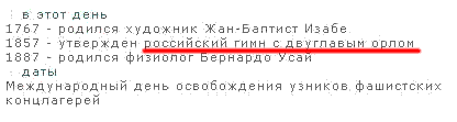 Все поняли? У нас оказывается гимн с двуглавым орлом! Кто бы мог подумать! Орел, видать, в припевах подпевает. Ведь одна голова - хорошо, а две - громче!