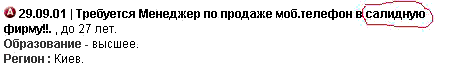 Как не сложно догадаться, особенно посмотрев на регион, фирма занимается оптовыми поставками сала! И туда, разумеется, требуется менеджер по мобильным телефонам, потому что все клиенты этой фирмы обеспечиваются мобильниками, чтобы они в любой момент могли заказать этот дивный продукт. Менеджеру, кстати, сало выдают бесплатно. Плюс еще два шмата сверху - за вредность! Ну это если менеджер вредный, конечно. А если полезный, тогда сверху выдают стопку горилки. Для достижения состояния полной нирваны - САЛО С ГОРИЛКОЙ! Эх, может, бросить все да и пойти туда менеджером? Я смогу! Я способный. И Сало с Горилкой обожаю...