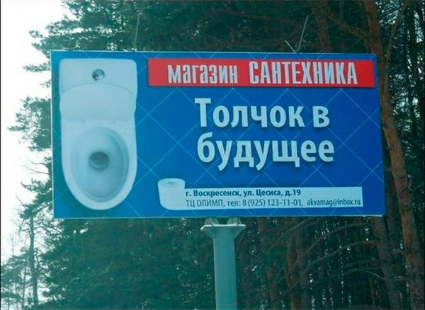 Почему в будущее - не очень понятно, но привлекает внимание. Со словом "толчок" можно любую рекламу придумать. Например, "толчок импульса". А что, для унитаза звучит очень аутентично. Или "пассионарный толчок" - о, вообще классно! Еще "подземный толчок" - тоже хорошо подходит!