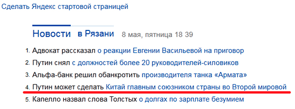 Последнюю новость (про Путина и Китай) я тоже хотел прислать. Когда обнаружил на Яндексе долго вкуривал, что же они хотели этим сказать?