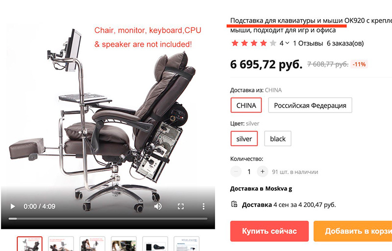 Простите за занудство, но что не так с подставкой для клавиатуры? Там же написано, "стул, системный блок, монитор, клавиатура и колонки в комплект не входят". Так что подставка - это та металлическая труба, которая к креслу крепится, на ней действительно только клавиатура лежит.