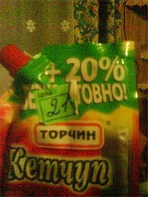 На заднем плане явно квартира, ценник явно отодран и приклеен заново, ну и плюс ко всему - за 21 гривну лично я упаковок не встречал, это там килограмм, а то и больше, того кетчупа должно быть.