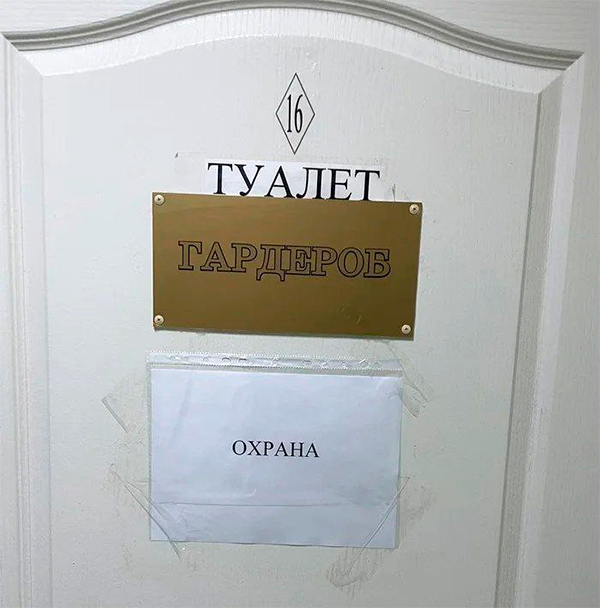 Объясняем. Это туалет. В котором стоят вешалки для пальто. Пальто охраняет специальный человек, чтобы их не украли. Этот же человек работает туалетным портье - подрабатывает, а то зарплата больно маленькая.
