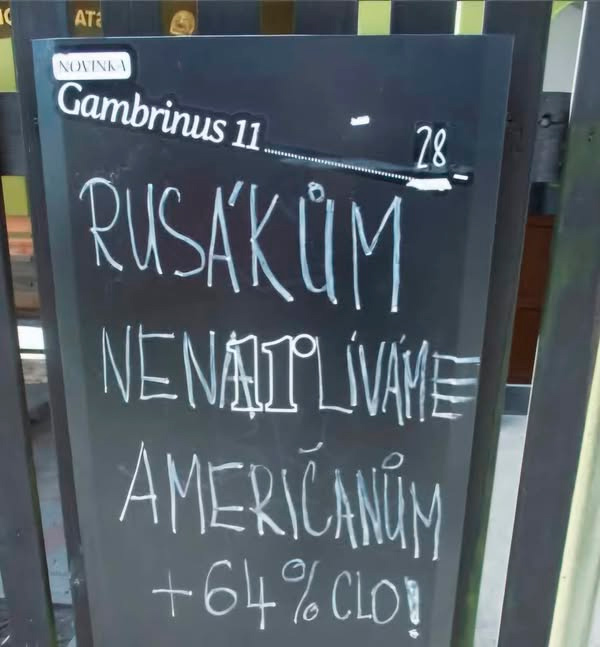 В барах Праги, замечает Виктор, хорошая клиентоориентированность. Надпись на плакате: "Русским [нецензурно] не наливаем, американцам +64% тариф".
