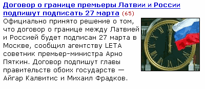Сайт Delfi, замечает S.R., всегда радует и заголовками, и текстом. На этот раз они рассказали о том, что скоро состоится граница премьеры Латвии и России. Договор об этом подпишут подписать 27 марта - ровно в 12 часов то ли дня, то ли ночи. Но так как премьера может и не состояться, тогда договор не подпишут подписать.