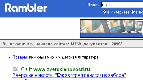 Ivan Ivanov собирался показать одной девушке, как именно пользоваться поиском в Интернете. Однако девушка была впечатлительная, и Ivan долго думал, какой бы критерий задать, чтобы в ответ не получить никакой порнухи. Задал слово "еж". Вот первая же ссылка поисковика: