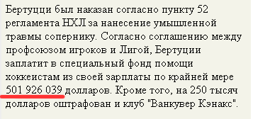 Хоккеист НХЛ Бертуцци во время матча нанес травму сопернику. Он его звезданул носом об лед и еще несколько раз повозил взад-вперед. Хоккейному хулигану, как сообщила "Лента.ру", - достойное наказание! Кроме того что Бертуцци дисквалифицировали, он еще заплатит небольшой, но вполне разумный штраф - в полмиллиарда долларов: