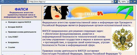 ФАПСИ, радуется dr.P.O.N., официально объявило о скидках в пять процентов на все свои виды деятельности. Один из этих видов вы можете наблюдать на баннере, обещающем скидки...