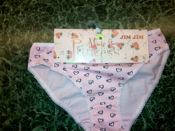 А в чём юмор с трусиками "made from pricess"? Ну трусики, ну от принцессы. Хотели бы сказать "сделано из принцессы", сказали бы "made of pricess". Кажется, если шутить то над словами жим-жим...